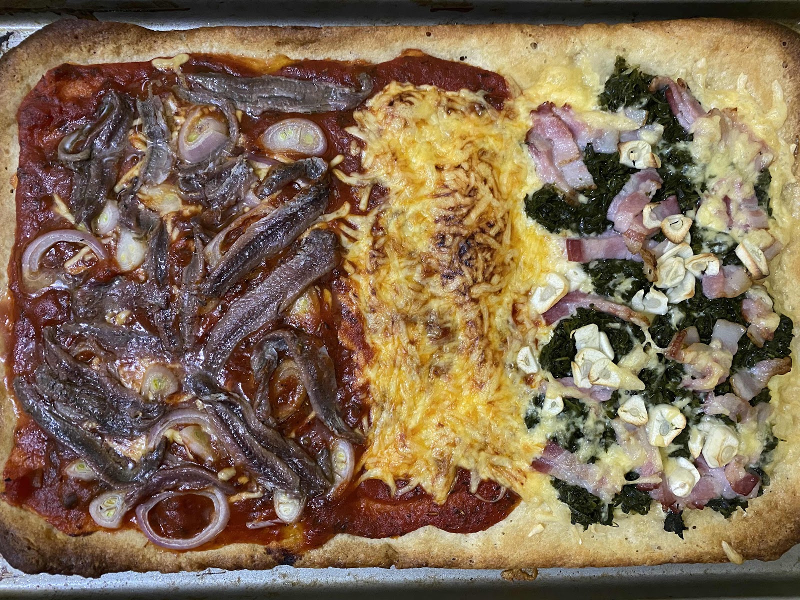 On the left is anchovy, middle plain cheese, right is bacon spinach. It came out thin crust like Sicilian pizza.